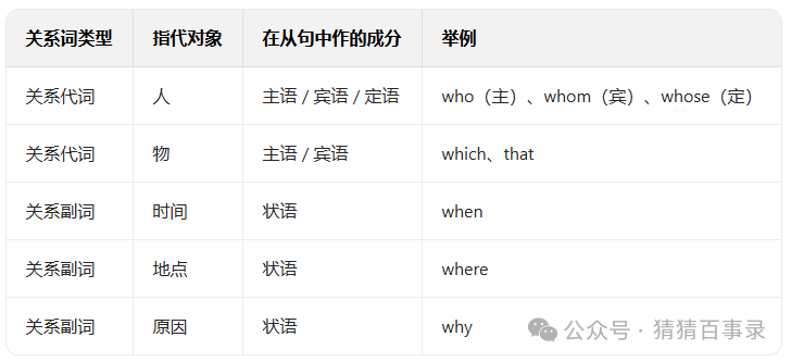 关系词的选择:按照先行词的性质(人 / 物 / 时间 / 地址 / 缘由)及正在从句中做的成分判断。从句需用响应的过去时态(一般过去时、过去进行时、过去未来时等);宾格)、whose(谁的)、which(哪一个)从语从句、宾语从句、表语从句、定语从句和状语从句。取40万英语教师配合前进,